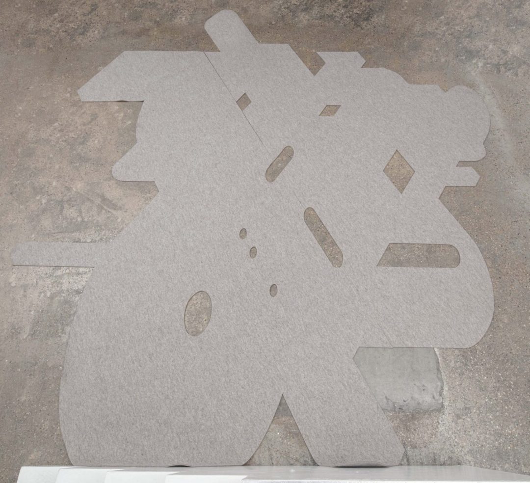 Gabi Schillig’s floor sculpture “Soft Isometry”, composed of two pieces of 5 mm saddle felt, exemplifies her ongoing exploration of soft architectures – spaces that are flexible, tactile, and spatially expansive. Made from felt, a material known for its soft yet resilient qualities, this sculpture occupies the floor with a gentle presence that both defines and responds to the surrounding space without imposing rigidity.